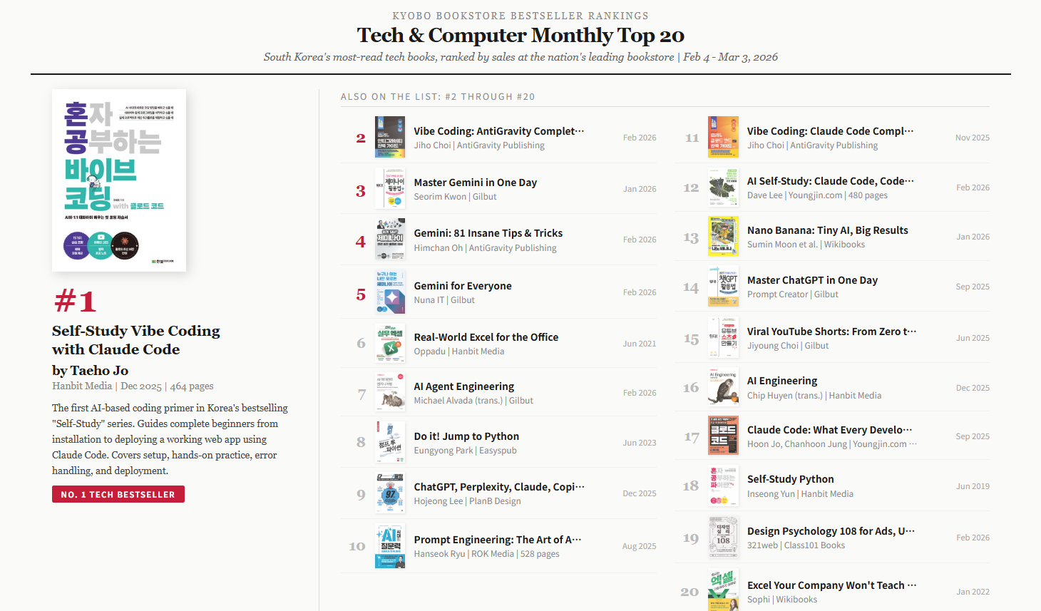 Dr. Jo's recent book on AI-assisted coding topped Kyobo Bookstore's monthly Tech & Computer chart for February 2026, reflecting growing public interest in AI-driven development tools.